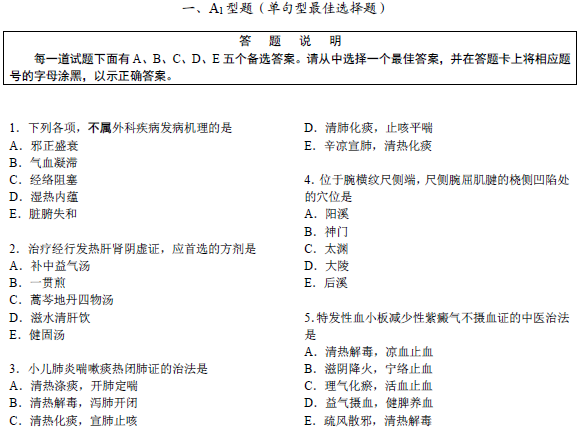 中医、中西医结合医师资格医学综合笔试全部采用选择题形式。各类选择题均由题干和选项两部分组成。题干是试题的主体,可由一段短语、问句或不完全的陈述句组成,也可由一段病例或图表、照片及其他临床资料来表示;选项由可供选择的词组或短句组成,也称备选答案。